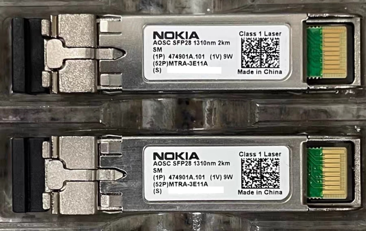 Nokia 474901A AOSC SFP28 25GB transceiver is used via LC connector with 1310nm wavelength, providing 2GBase-IR throughput of up to 2 kilometers through single-mode fiber (SMF).